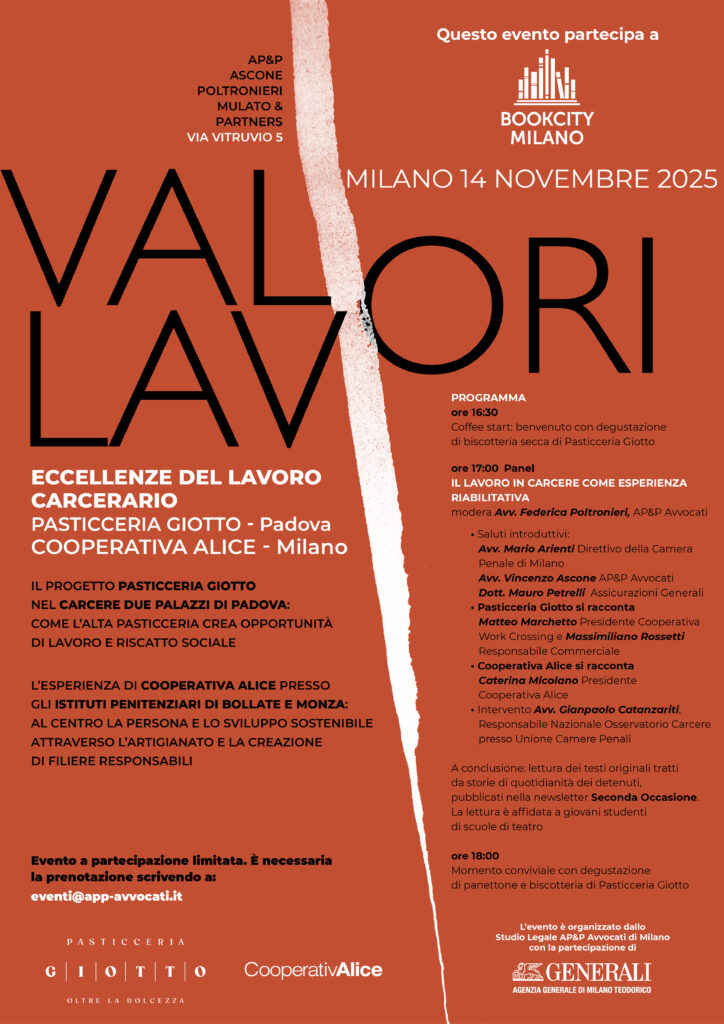 Il 14 novembre 2025 AP&P Avvocati ospita nei propri spazi due eccellenze nella promozione del lavoro carcerario: Pasticceria Giotto, che ha avviato da venti anni un laboratorio di alta pasticceria all’interno del carcere Due Palazzi di Padova, e Cooperativa Alice, che, presso gli istituti penitenziari di Bollate e Monza, ha promosso un progetto di sviluppo di un laboratorio sartoriale, in cui le detenute ricevono una formazione professionale di alto livello in ambito tessile.